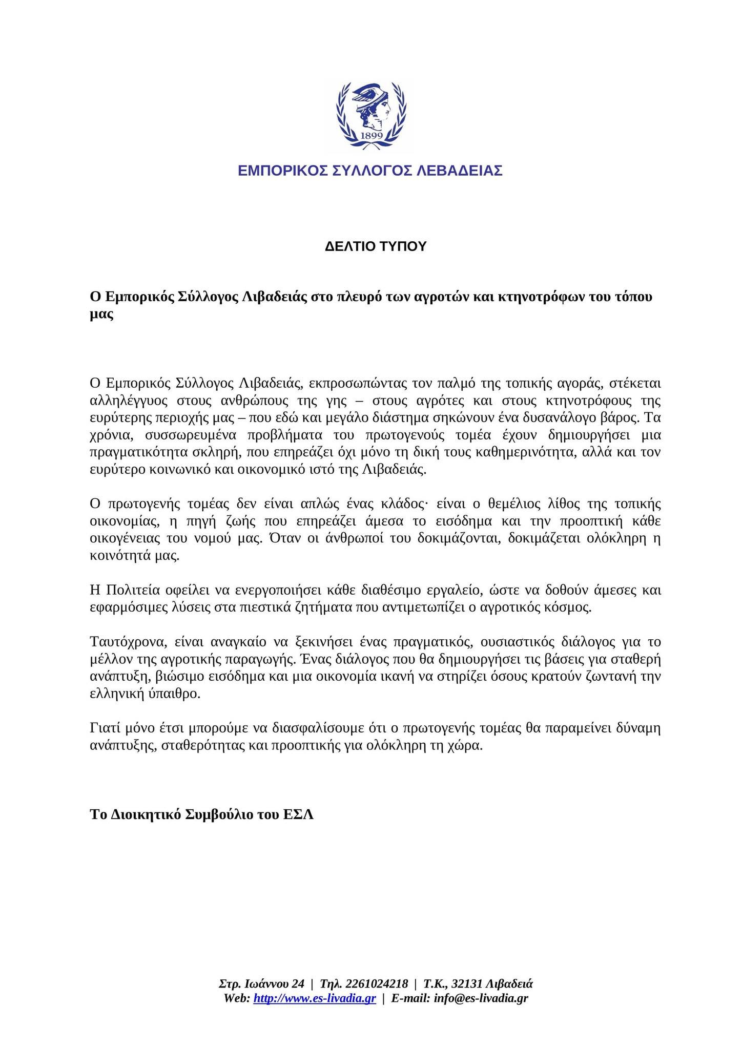 Ο Εμπορικός Σύλλογος Λιβαδειάς, εκπροσωπώντας τον παλμό της τοπικής αγοράς, στέκεται αλληλέγγυος στους ανθρώπους της γης m στους αγρότες και στους κτηνοτρόφους της ευρύτερης περιοχής μας – που εδώ και μεγάλο διάστημα σηκώνουν ένα δυσανάλογο βάρος. Τα χρόνια, συσσωρευμένα προβλήματα του πρωτογενούς τομέα έχουν δημιουργήσει μια πραγματικότητα σκληρή, που επηρεάζει όχι μόνο τη δική τους καθημερινότητα, αλλά και τον ευρύτερο κοινωνικό και οικονομικό ιστό της Λιβαδειάς.