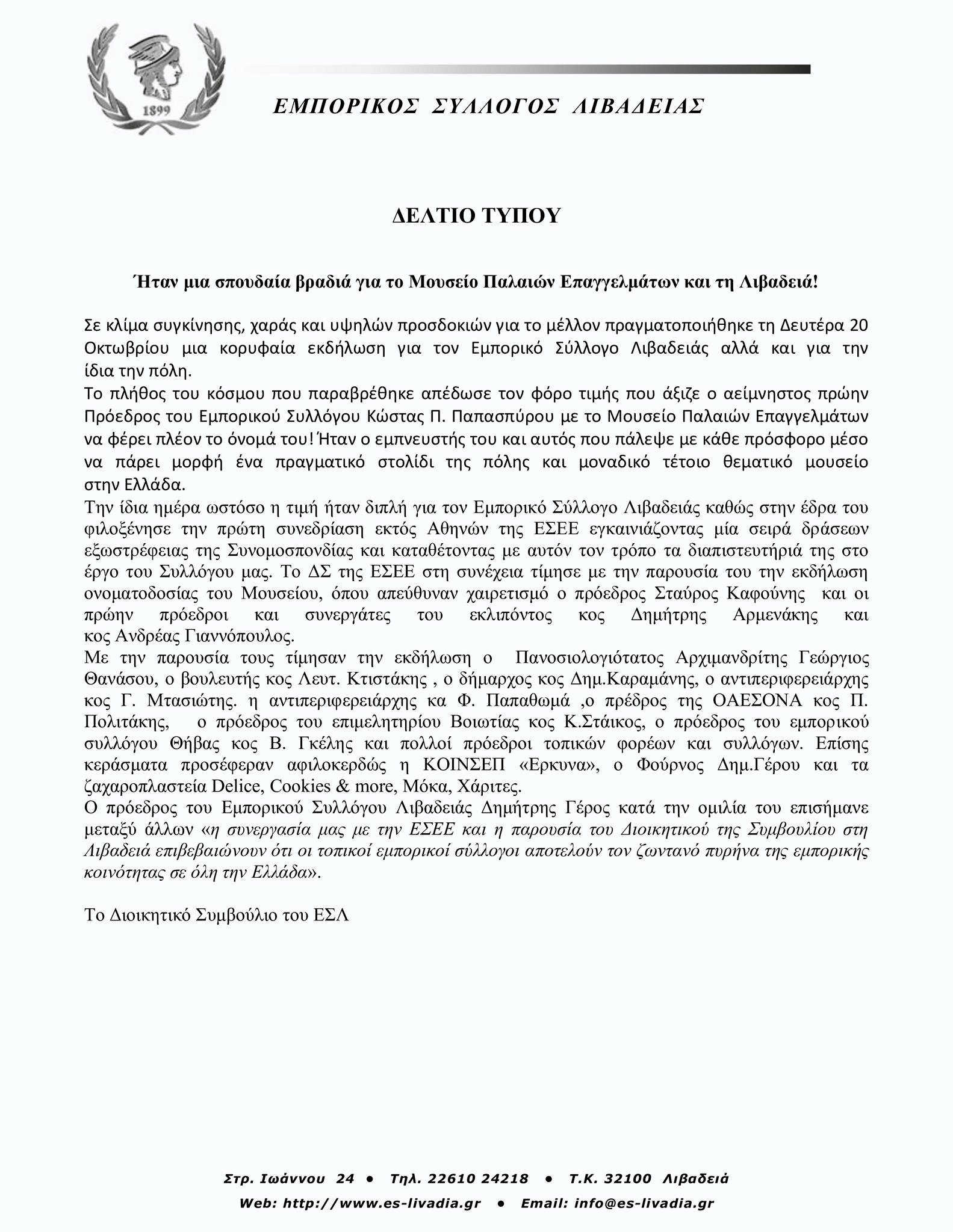 Την ίδια ημέρα ωστόσο η τιμή ήταν διπλή για τον Εμπορικό Σύλλογο Λιβαδειάς καθώς στην έδρα του φιλοξένησε την πρώτη συνεδρίαση εκτός Αθηνών της ΕΣΕΕ εγκαινιάζοντας μία σειρά δράσεων εξωστρέφειας της Συνομοσπονδίας και καταθέτοντας με αυτόν τον τρόπο τα διαπιστευτήριά της στο έργο του Συλλόγου μας. Το ΔΣ της ΕΣΕΕ στη συνέχεια τίμησε με την παρουσία του την εκδήλωση ονοματοδοσίας του Μουσείου, όπου απεύθυναν χαιρετισμό ο πρόεδρος Σταύρος Καφούνης και οι πρώην πρόεδροι και συνεργάτες του εκλιπόντος κος Δημήτρης Αρμενάκης και κος Ανδρέας Γιαννόπουλος.