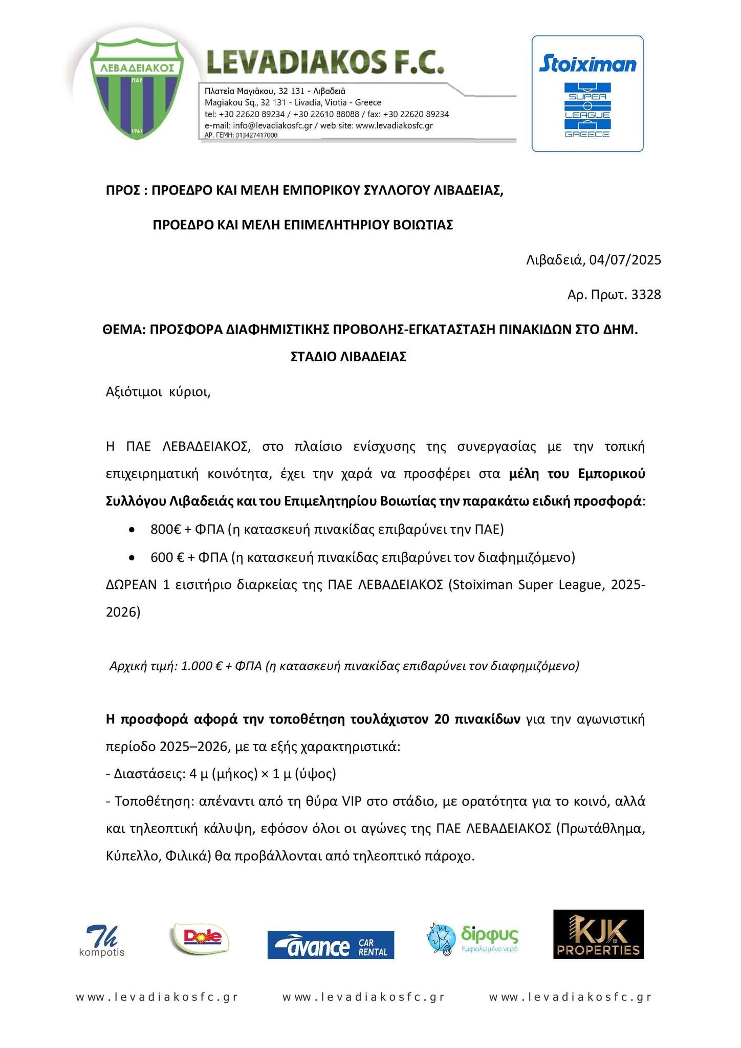 Με ιδιαίτερη χαρά σας ενημερώνουμε ότι, με δική μας πρωτοβουλία και στο πλαίσιο της συνεργασίας με την ΠΑΕ ΛΕΒΑΔΕΙΑΚΟΣ, καταλήξαμε σε ειδική προσφορά διαφημιστικής προβολής για τα μέλη μας, για την αγωνιστική περίοδο 2025-2026.