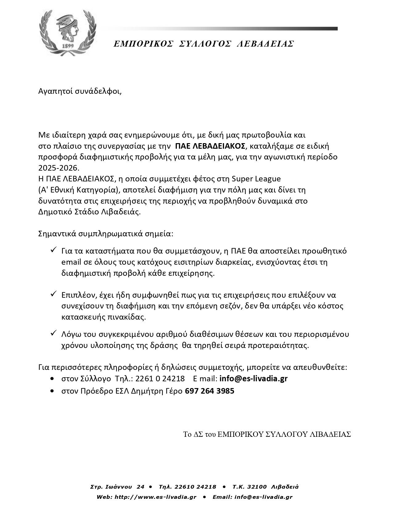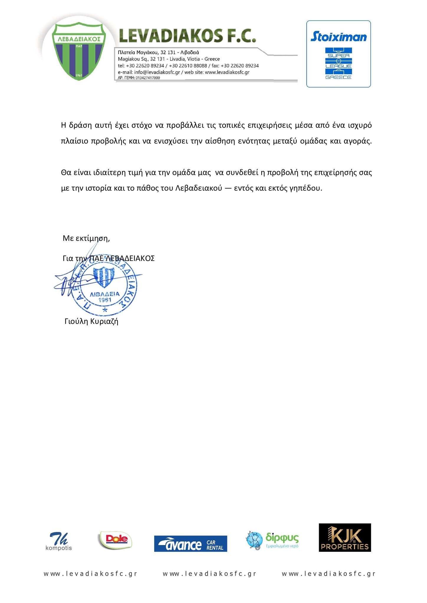 Θα είναι ιδιαίτερη τιμή για την ομάδα μας να συνδεθεί η προβολή της επιχείρησής σας με την ιστορία και το πάθος του Λεβαδειακού — εντός και εκτός γηπέδου.